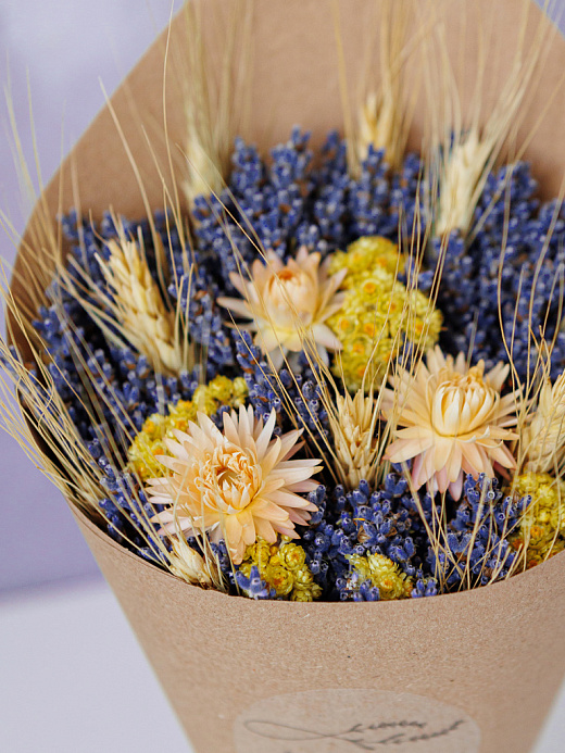 Средний букет из флористического лавандина, иммортеля, пшеницы и цветов гелихризума - стильный подарок с натуральным ароматом лаванды и полевым настроением. Сухоцветы выглядят эстетично в интерьере, не требуют ухода и долго сохраняют форму и цвет.