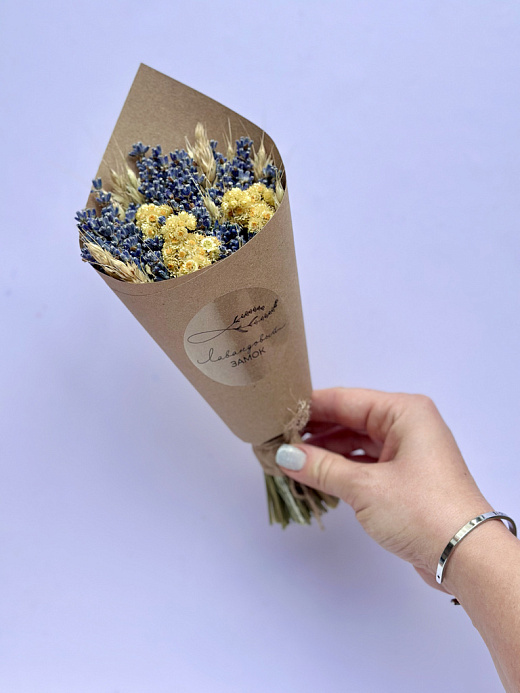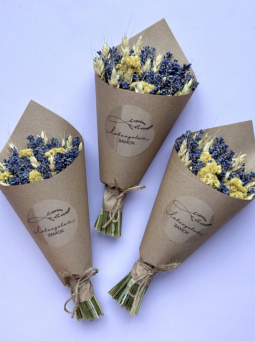 Небольшие букетики лаванды с пшеницей и иммортелем (бессмертником) от «Лавандового замка» - аккуратный и практичный подарок, который приятно вручить как самостоятельный знак внимания или использовать как часть комплектации подарочных наборов для корпоративных заказов. Натуральная сухая лаванда сохраняет аромат и эстетичный вид, хорошо сочетается с подарочной упаковкой, открытками, свечами и другими элементами набора.