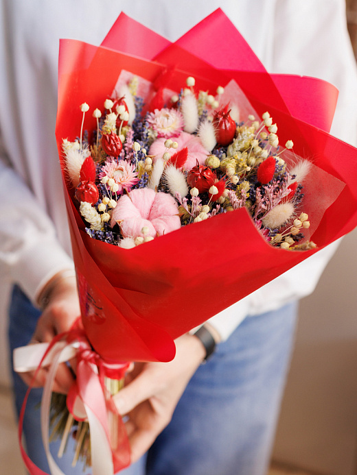 Букет в красной гамме с лавандой и сухоцветами "Страстный"